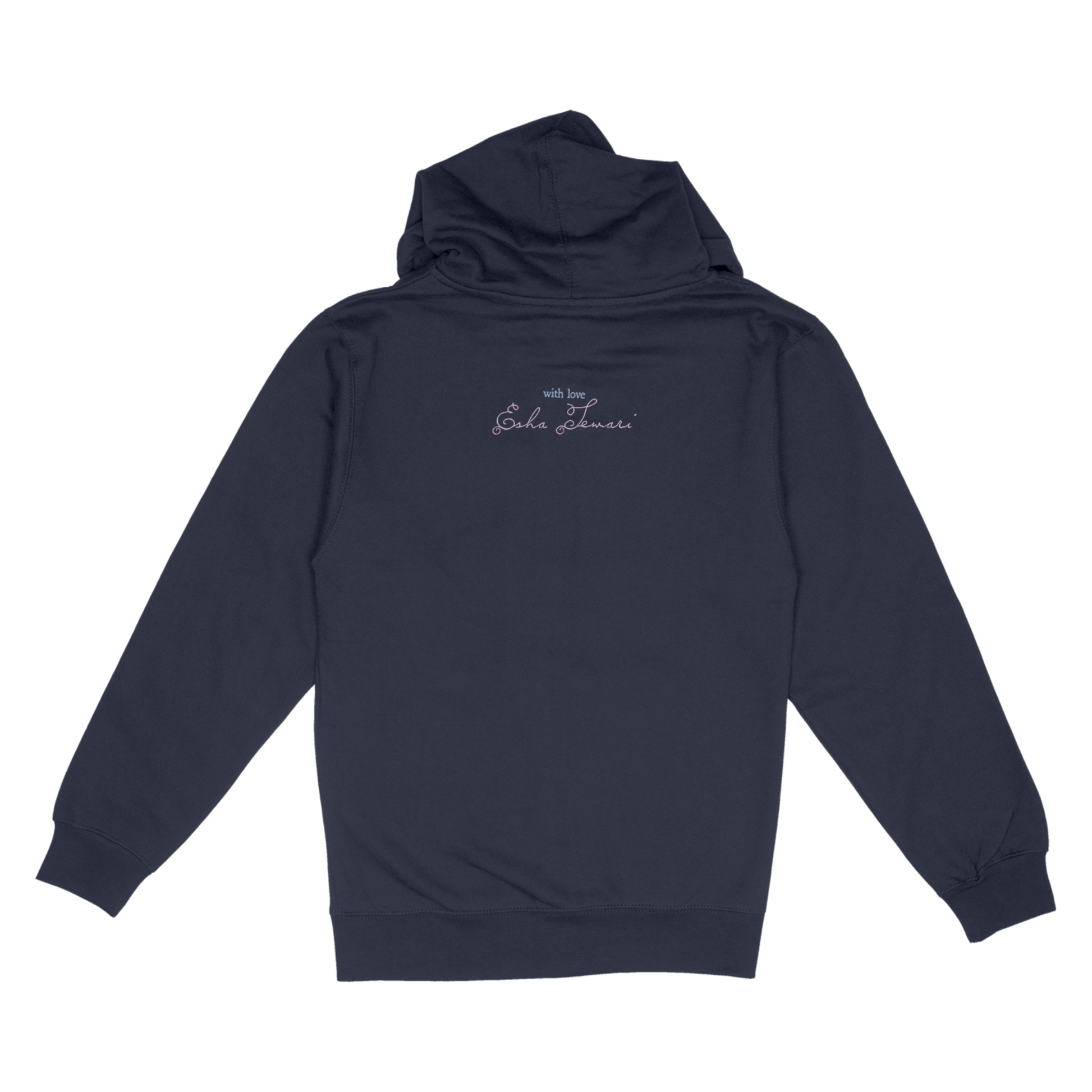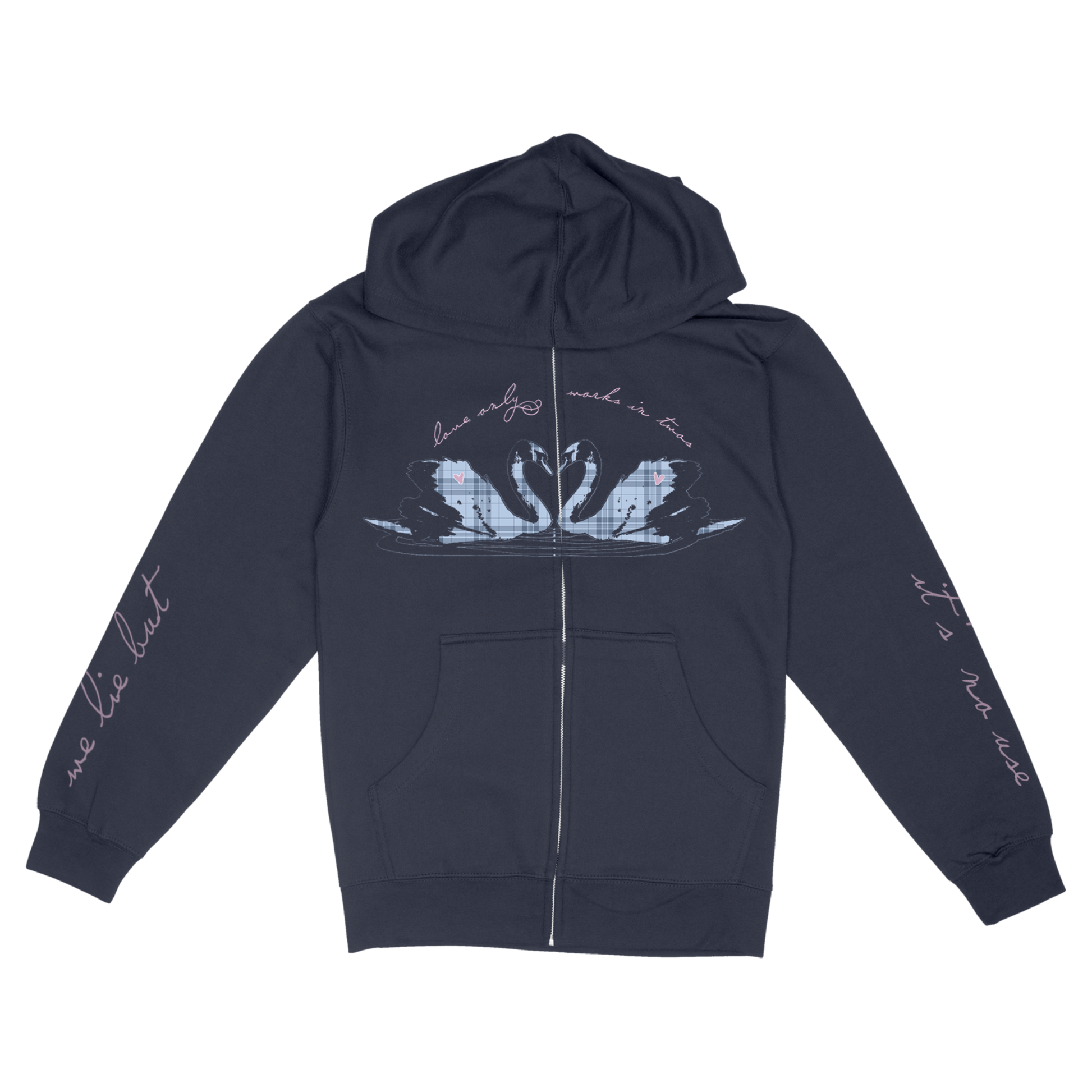 Midweight zip up navy hoodie with 'Love only works in twos' design on front, back and sleeves.